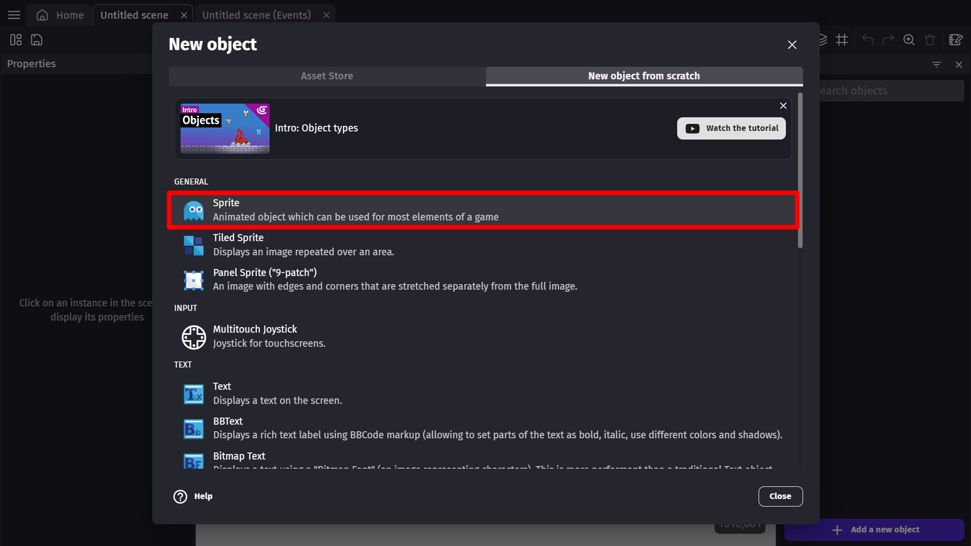 From the New object from scratch tab in the new window, choose "Sprite" from the list to create a new sprite object in your game scene.